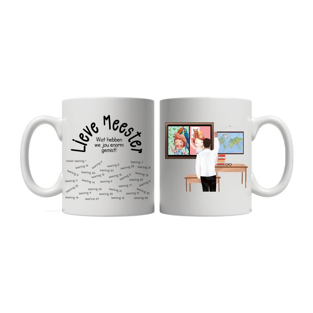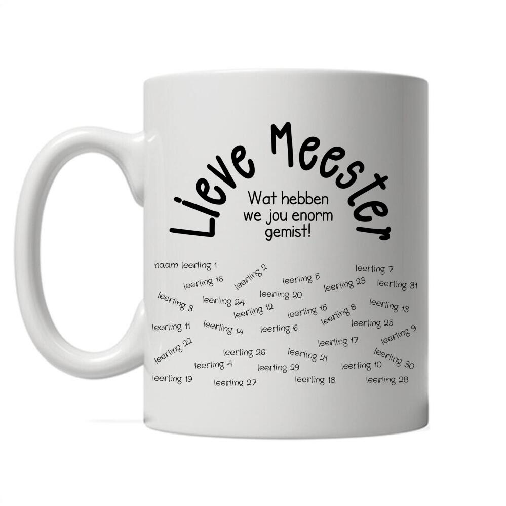 Is de meester terug van vakantie of een was hij overspannen van jullie, dan is dit de juiste mok voor hem.Zet alle namen van de klas op de mok en laat hem elke dag genieten als hij koffie of thee drinkt.