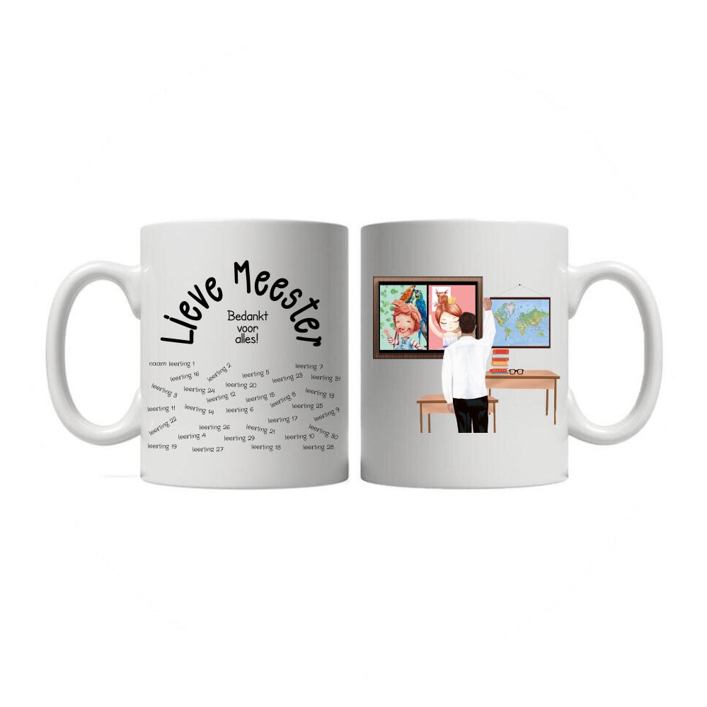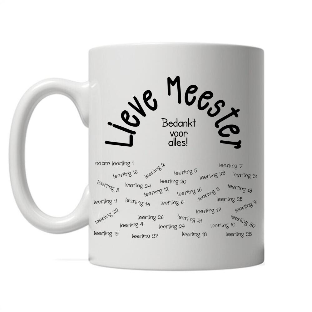 Bedank je meester voor alles wat hij heeft gedaan. Schrijf alle namen van de groep of klas op de mok